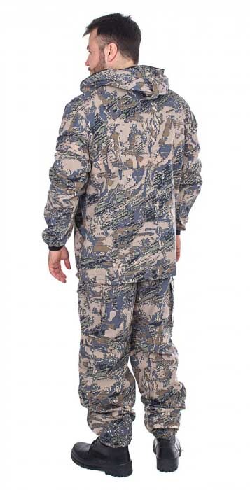 Состоит из куртки и брюк. Куртка с капюшоном и противомоскитной сеткой, убираемой в потайной нагрудный карман.