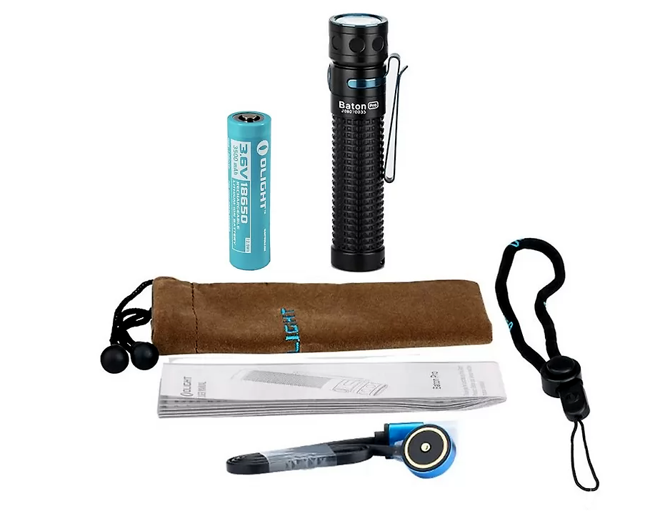 Комплектация: фонарь Olight Baton Pro, мешочек для переноски Olight, магнитное зарядное USB устройство MMC, аккумулятор OOlight ORB-186C35 3500 mAh, темляк, инструкция (+русский язык).