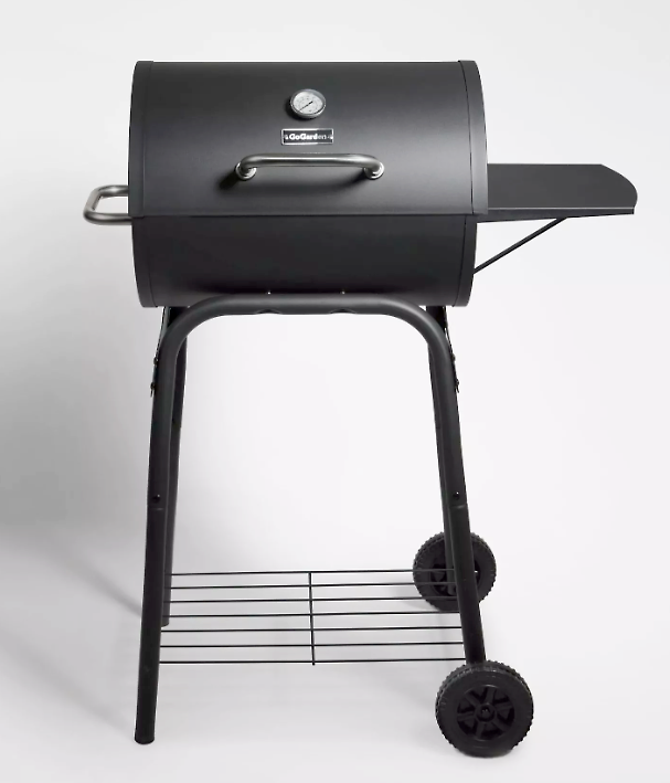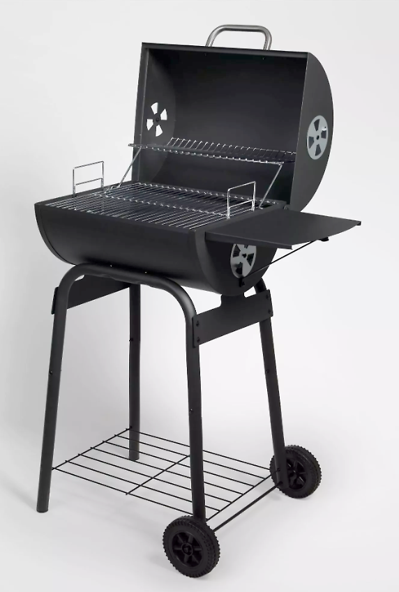 Стационарный угольный гриль-бочка с толстыми стенками, массивной рамой и регулировкой угольной решетки по высоте.