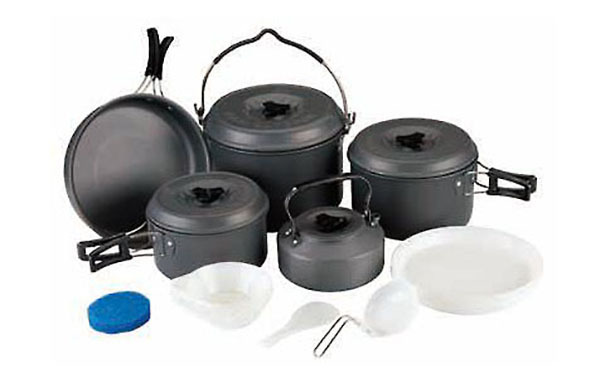 Котелок, 2 кастрюли, чайник, сковорода, половник, 3 крышки, 6 мисок, 4 тарелки, ложка, губка меланиновая.