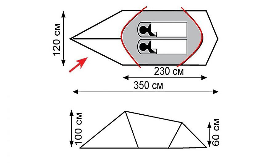 - Размер внутренней палатки ДхШхВ, см120 х 230