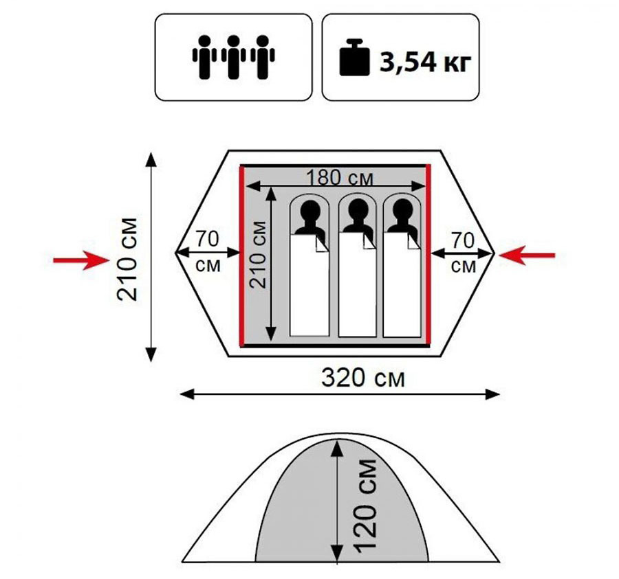 - Размер внутренней палатки ДхШхВ, см180 х 210