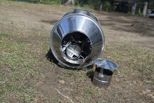 Топка у печи "Громила" цилиндрической формы и благодаря такой геометрии ее практически не ведет при сильных перепадах температур. Торцы топки выполнены для дополнительной жесткости в виде конусов. Внутри торцы для обеспечения достаточной теплоизоляции заполнены камневатой Rockwool. Что обеспечивает хорошую теплоизоляцию топки и позволяет надежно защитить тент палатки (сзади) и Ваши руки от возможных ожогов о дверцу топки.