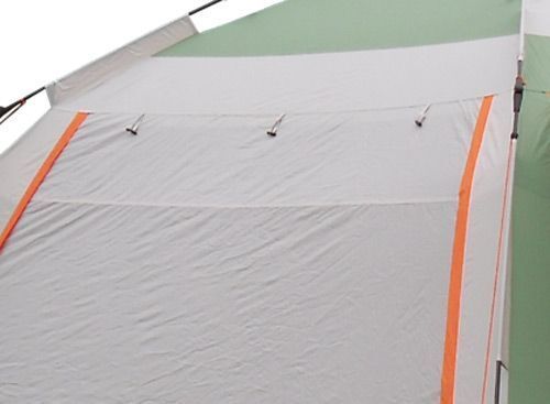 Входы шатра и окна на стенках оснащены противомоскитной сеткой и дублируются ветро/водозащитными стенками. В комплекте с шатром идут две стальные стойки. Так что при желании вы можете поставить одну из стенок входа как козырек. По низу шатра идет ветрозащитная юбка. В качестве опции можно приобрести для данной модели дополнительный пол из армированного полиэтилена.