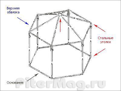 Каркас беседки изготовлен из стальной трубы Ø 18 и 22 мм, имеет нижнее основание и покрыт порошковой краской. Нижнее основание и верхняя обвязка служат для повышения прочности конструкции. Для фиксации элементов каркаса между собой используются кнопки-защёлки. Соединительные элементы (крестовины) выполнены из стальной трубы увеличенной толщины.