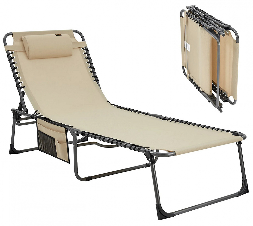 Раскладной шезлонг с отстёгивающимся подголовником, быстро раскладывается и собирается, имеет 4 положения спины и 2 положения для ног.