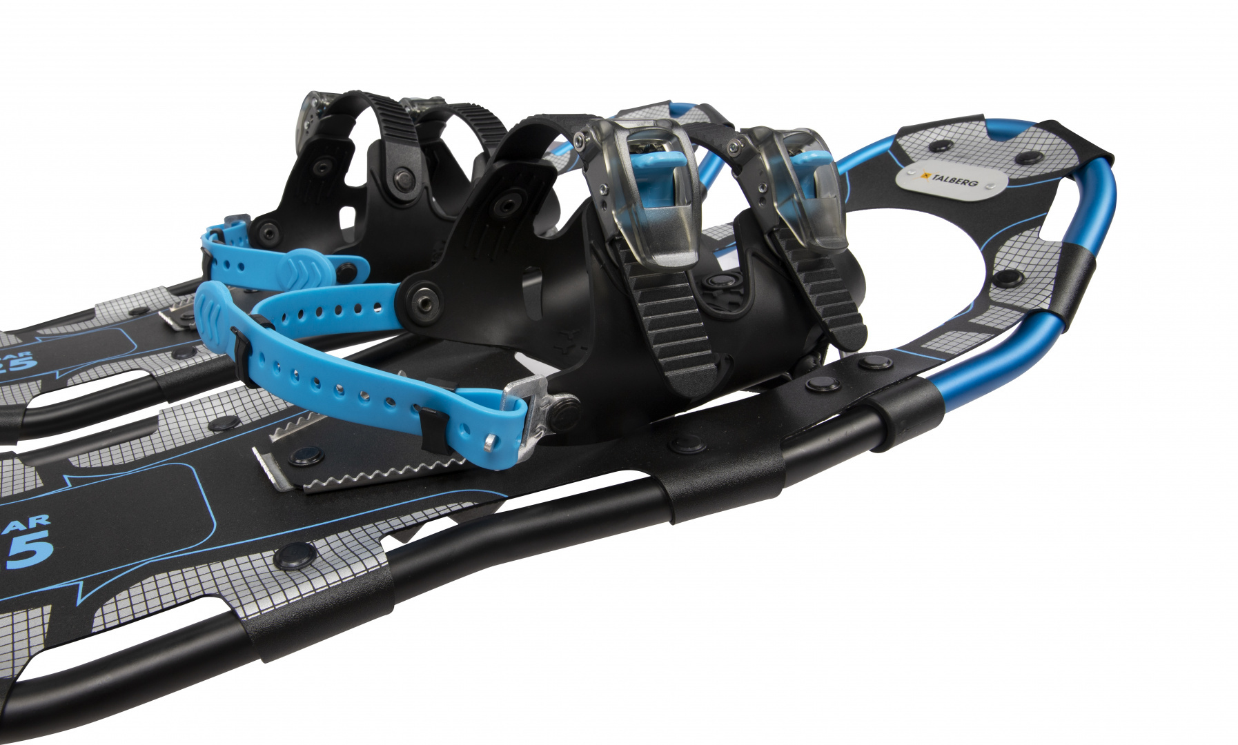 Снегоступы фиксируют обувь с помощью двух независимых замков с храповым механизмом – система Double Ratchet Buckle, а так же стального зубчатого фиксированного подпяточника и регулируемого ремня. Замки позволяют регулировать степень обхвата для разного объёма обуви, и оперативно ослаблять фиксацию.